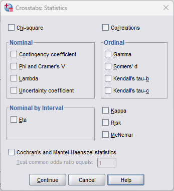 Chi-square➔chisq = TRUECorrelations➔correlations = TRUEContingency coefficient➔cont_coef = TRUEPhi and Cramer's V➔phi_cramer = TRUELambda➔lambda = TRUEUncertainty coefficient➔uncert_coef = TRUEGamma➔gamma = TRUESomers' d➔somers_d = TRUEKendall's tau-b➔tau_b = TRUEKendall's tau-c➔tau_c = TRUEEta➔eta = TRUEKappa➔kappa = TRUERisk➔risk = TRUEMcNemar➔mcnemar = TRUECochran's and Mantel-Haenszel...➔cmh = TRUE(requiere pasar una tercera variable en el argumentolayer_var).