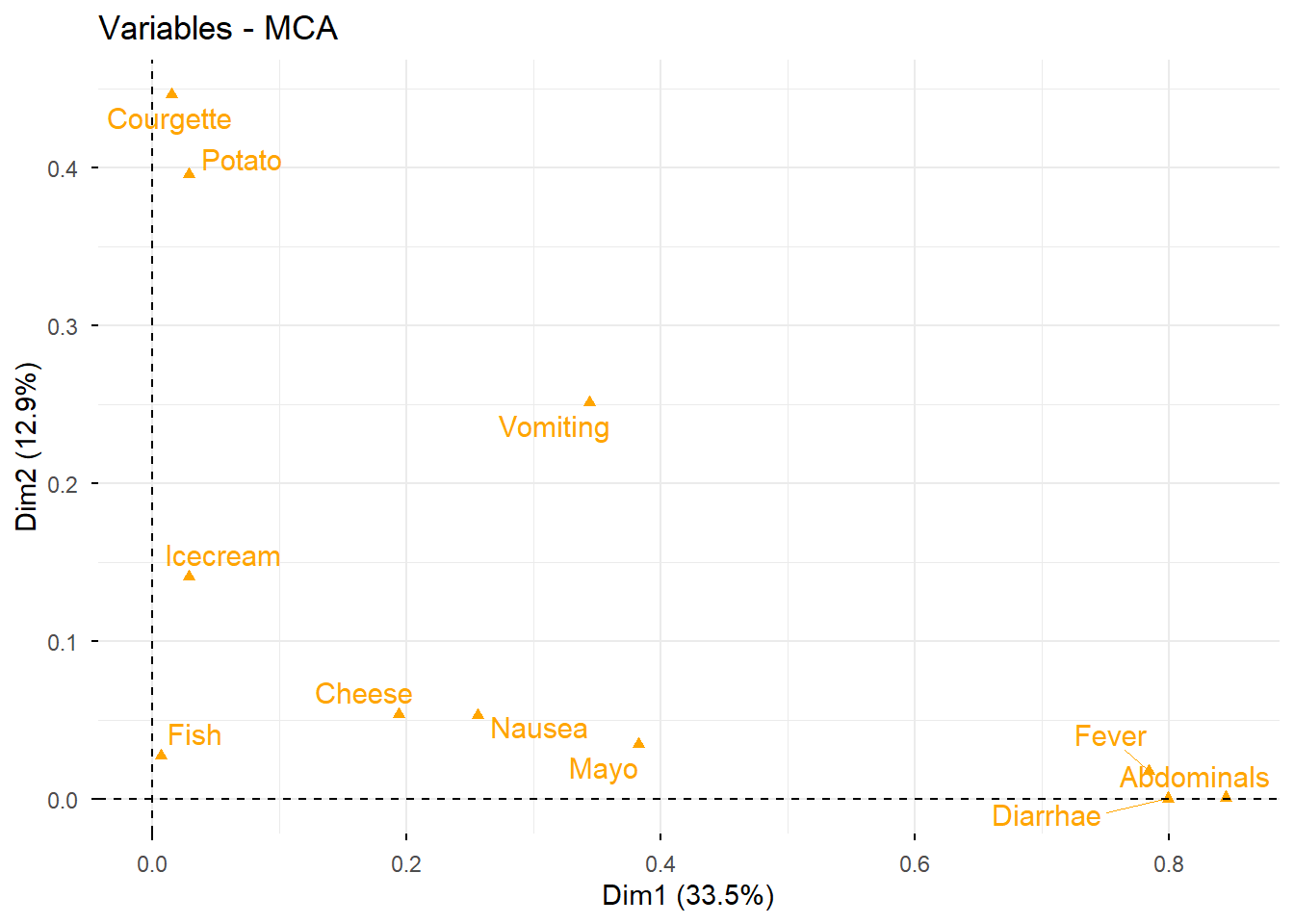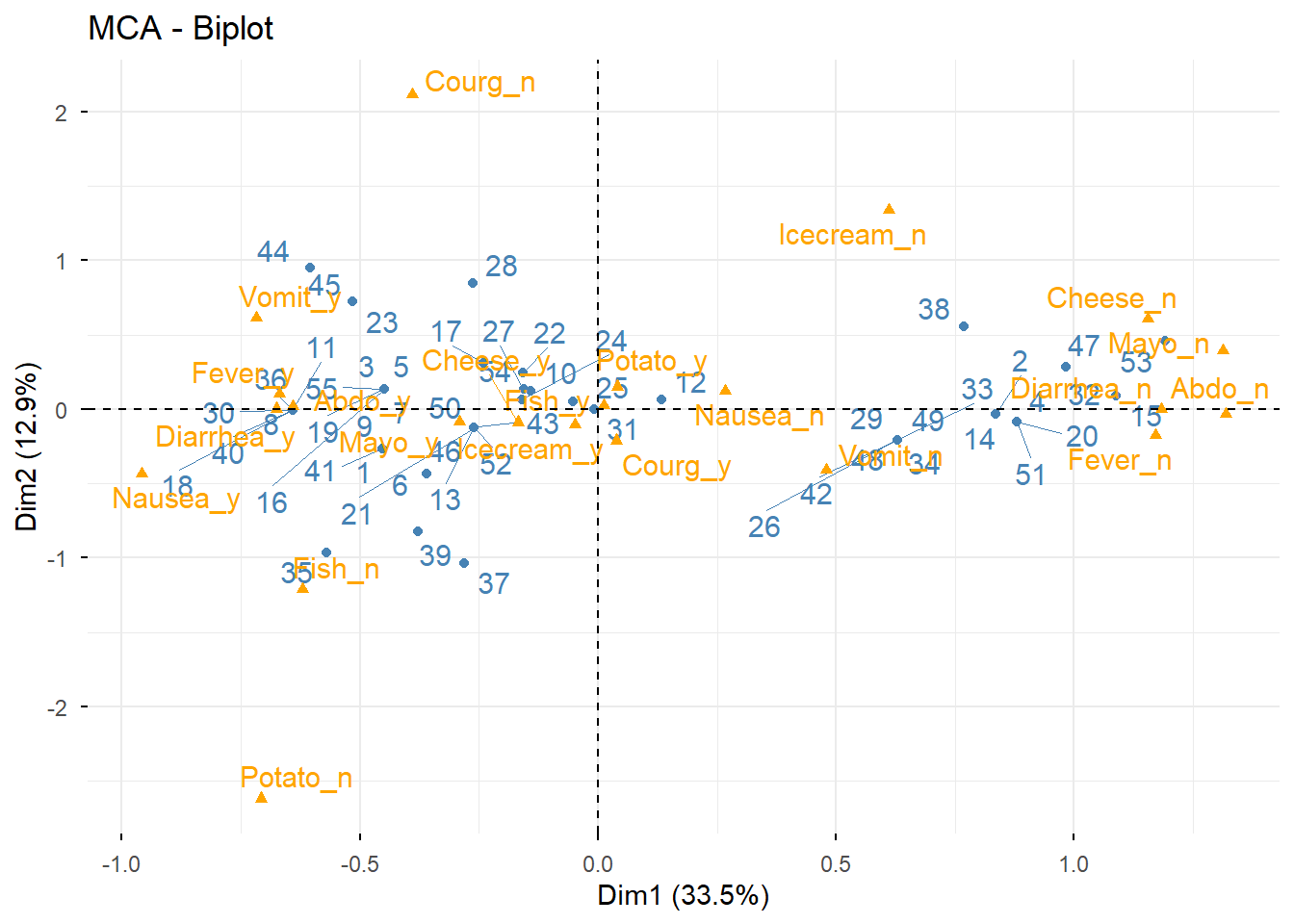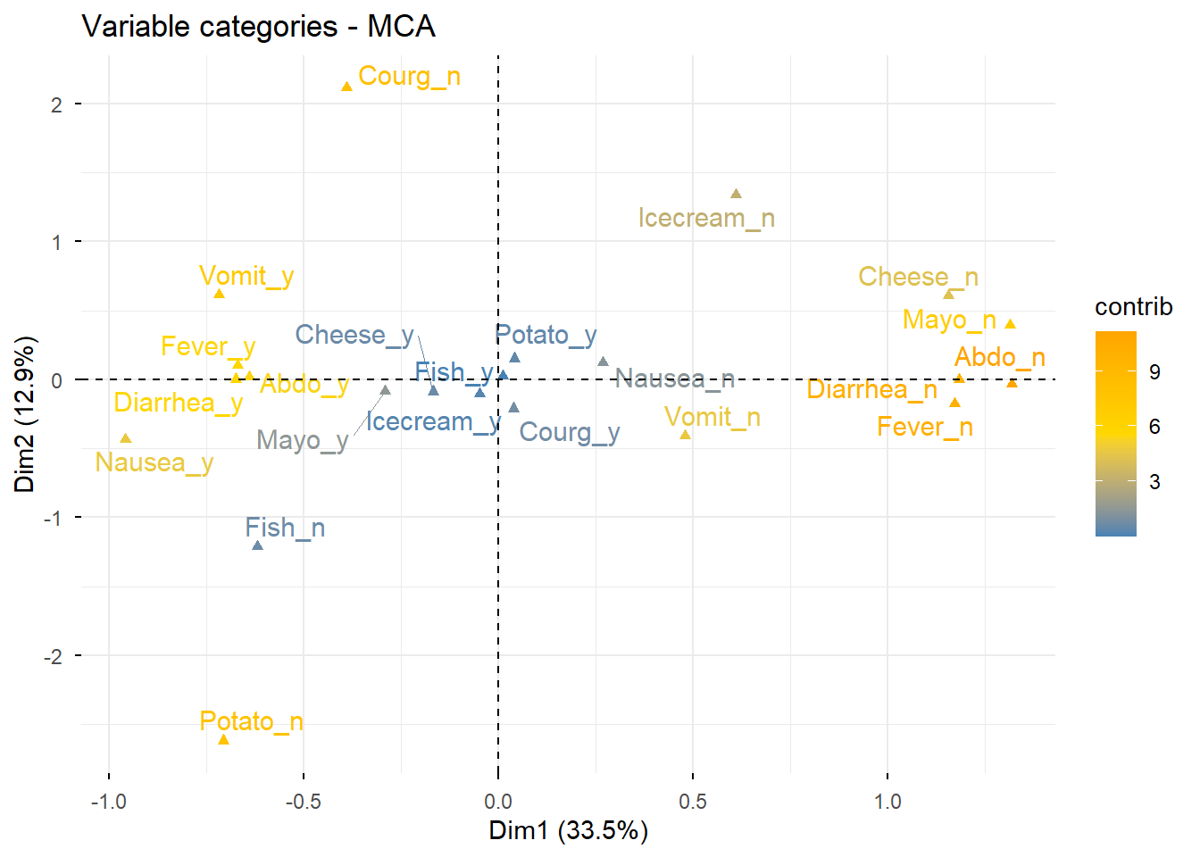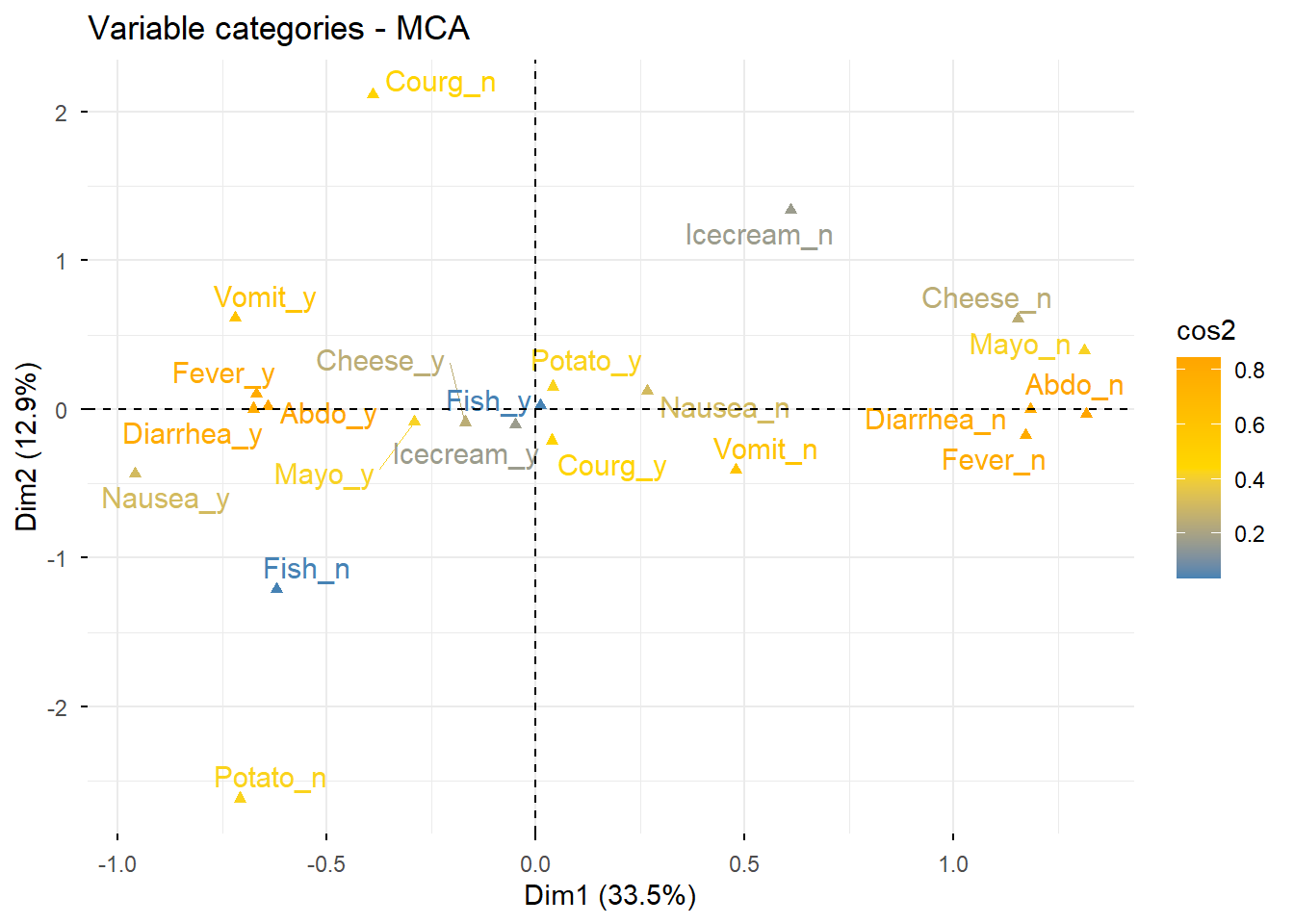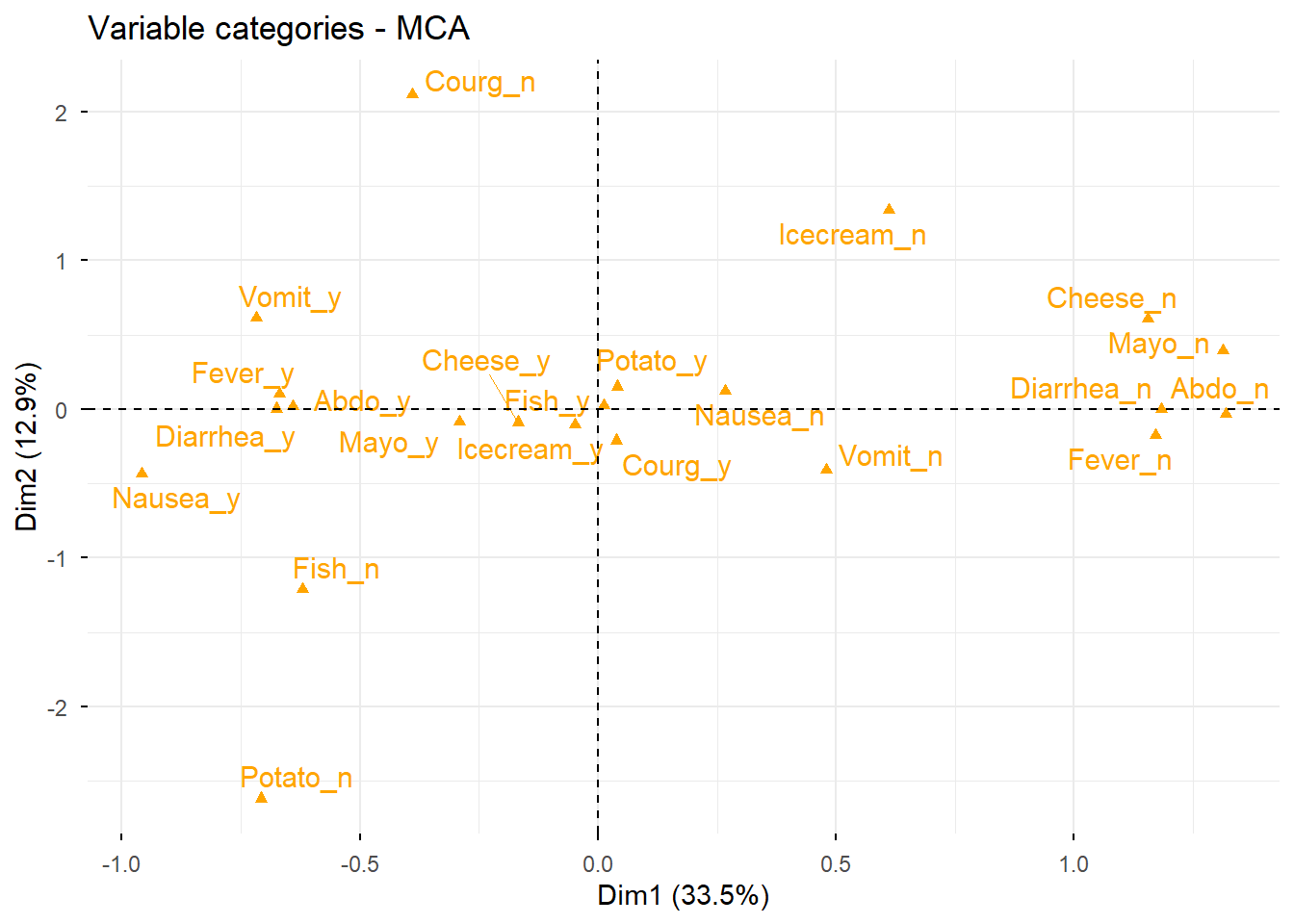 res.mca$call$marge.col Nausea_n Nausea_y Vomit_n Vomit_y Abdo_n Abdo_y