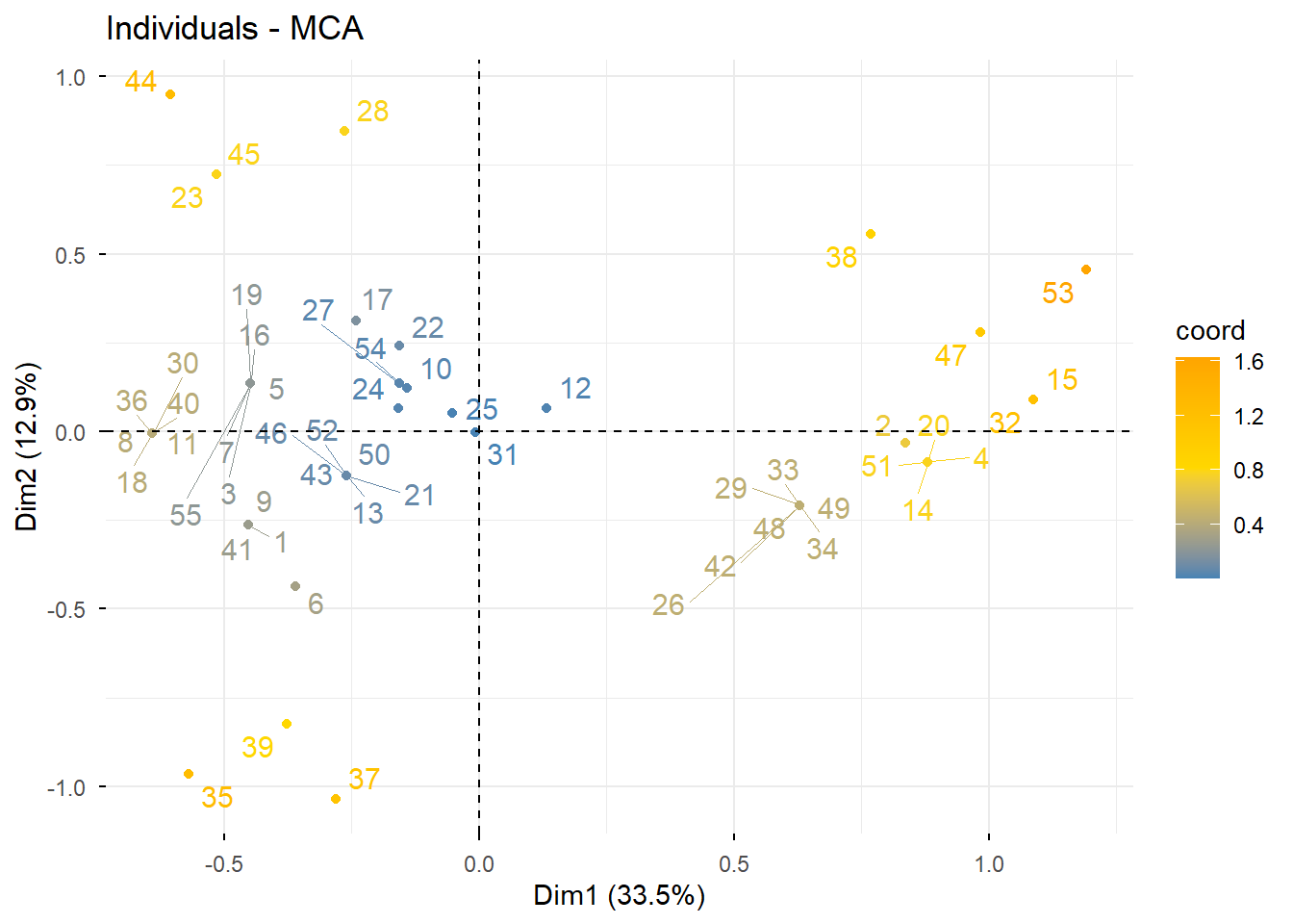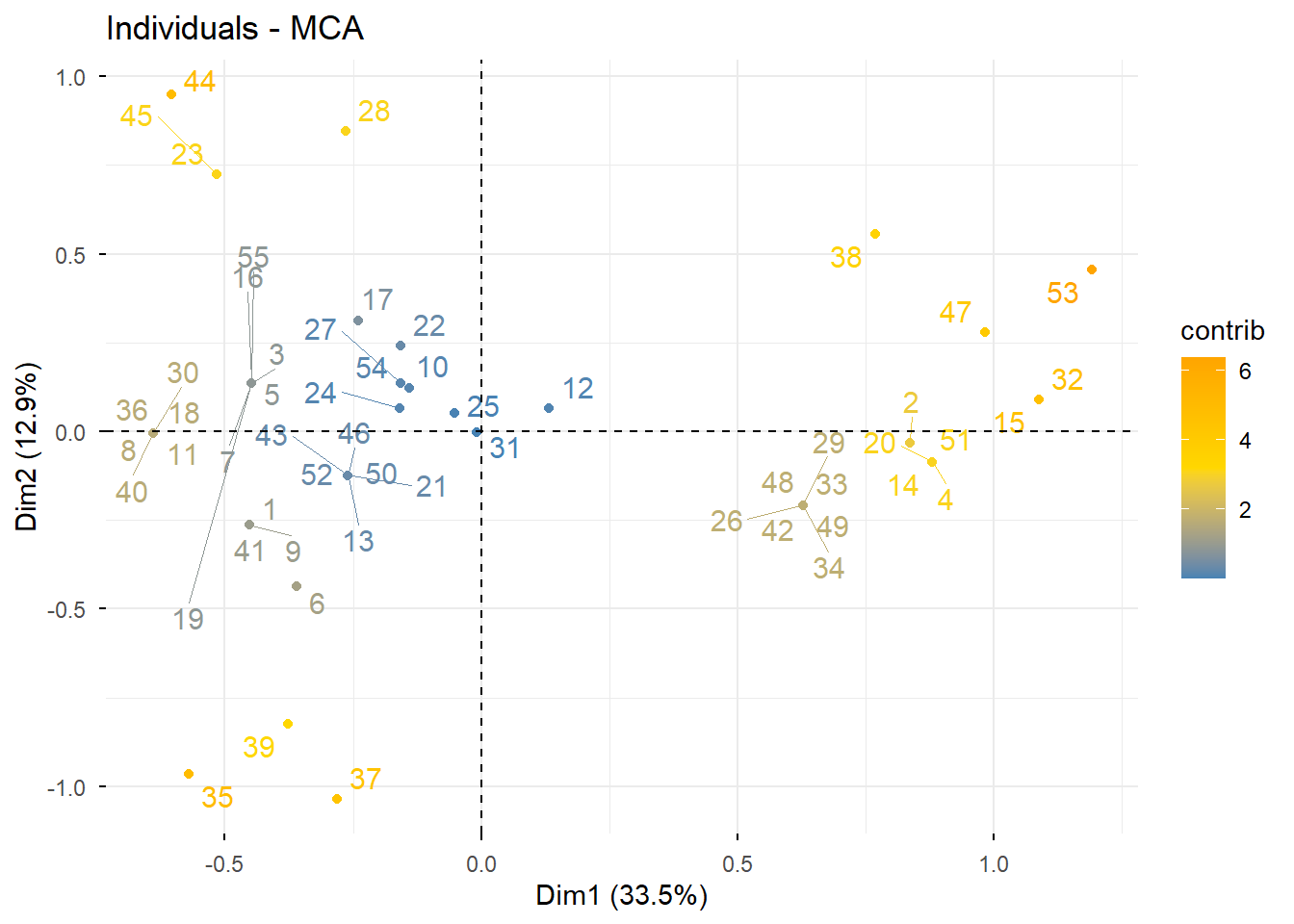 res.mca$ind$contrib Dim 1 Dim 2 Dim 3 Dim 4 Dim 5