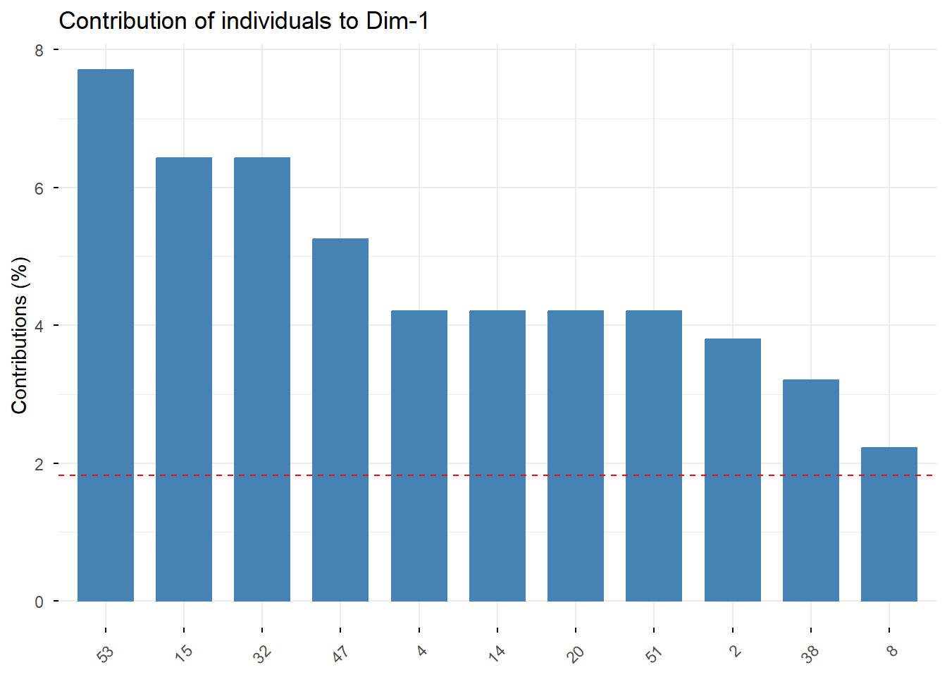 fviz_contrib(res.mca, choice = "ind", axes = 1, top = trunc(nrow(data.active)*0.2))